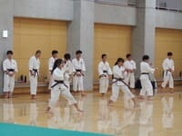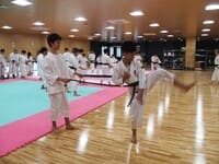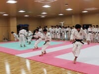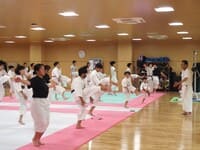 引き続き県内外から中学、高校、大学少林寺拳法部員、教職員支部員、一般財団法人少林寺拳法連盟個人会員、約50名の拳士が集まり、空調の無い暑い体育館の中、トレーニング、基本修練、法形修練に元気な声、気合を響かせていました。