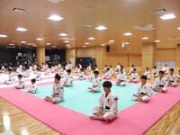 午前中はビデオによる師家講話、グループディスカッション、、午後からは全体での基本修練、コース及び資格別に分かれての修練が行われ、受講者は蒸し暑さに負けず熱心に取り組んでいました。